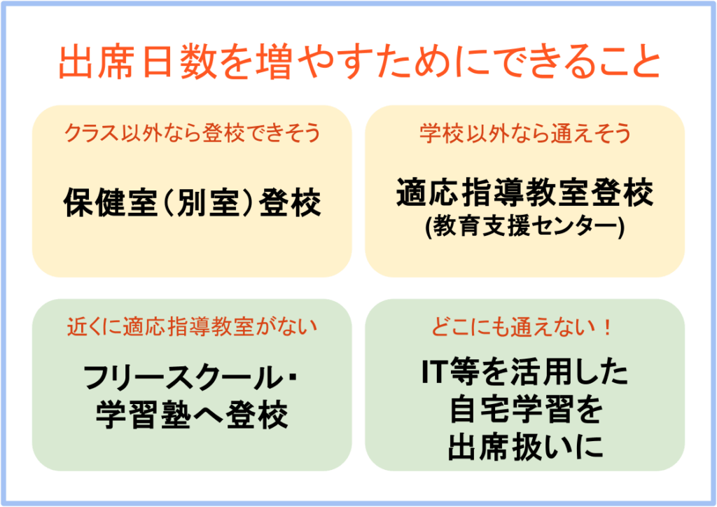 1. 保健室登校・別室登校 クラスには入れなくても、学校内の保健室や相談室などに登校することで「出席」と認められるケースです 。