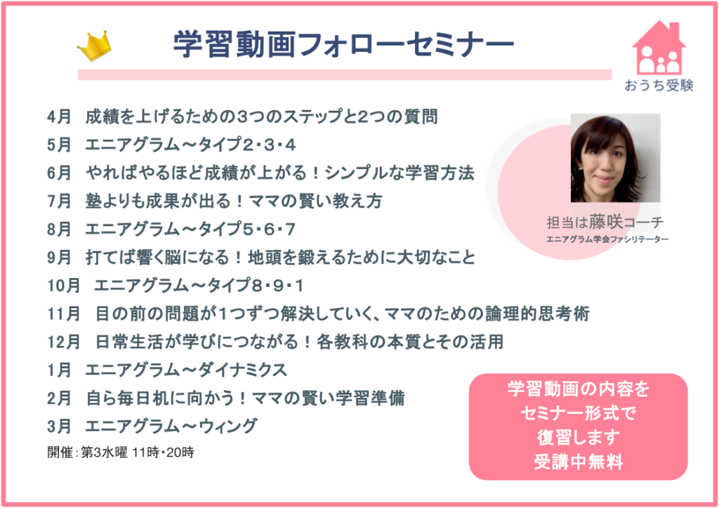 保護者向けコーチングセミナーでは扱わない学習動画の内容をテーマごとに深掘りし、毎月セミナー形式で学びます